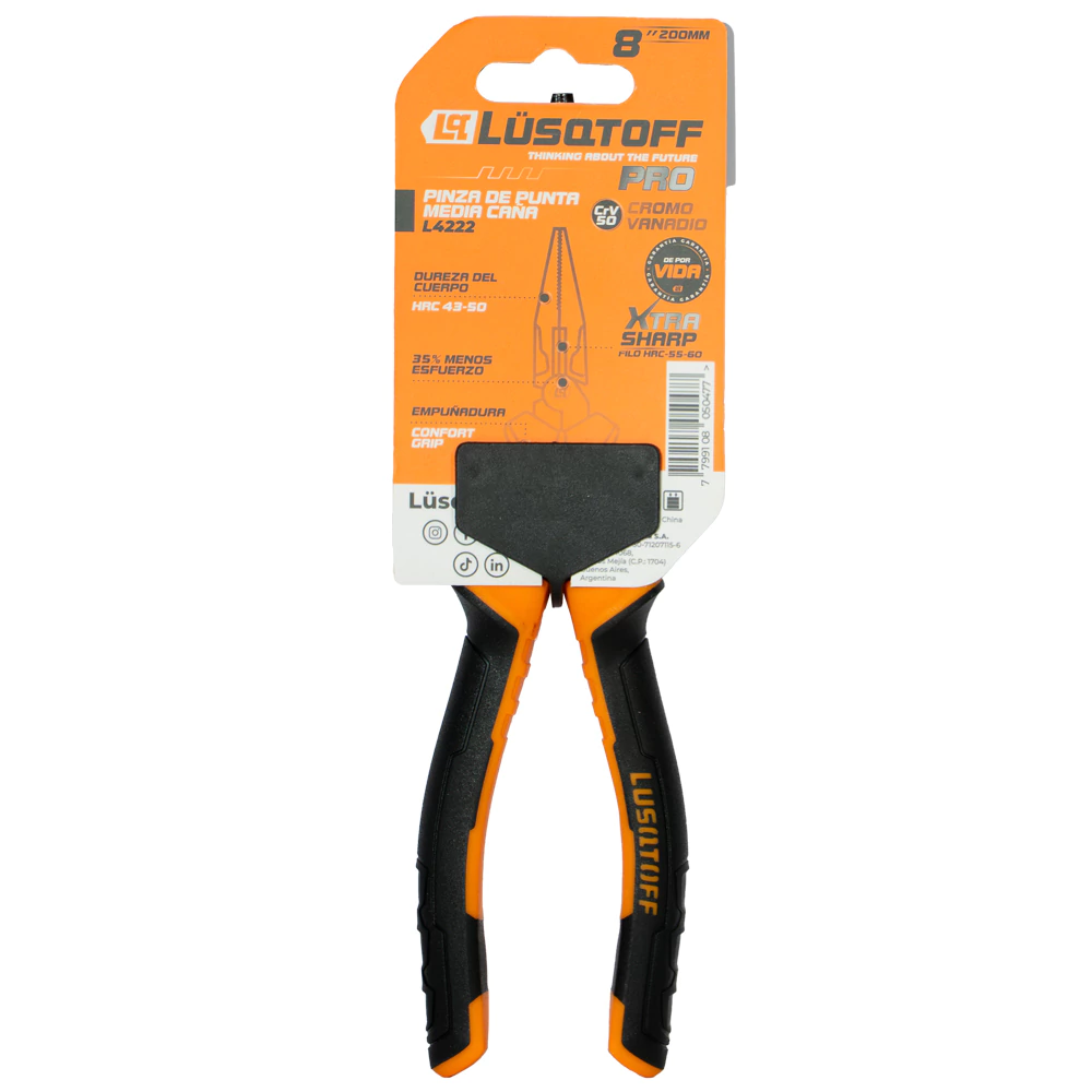 La Pinza de Punta Pro Media Caña 8″ Lusqtoff L4222 combina potencia, precisión y comodidad, ideal para trabajos de agarre, sujeción y corte en zonas difíciles. Fabricada en acero cromo vanadio (CR-V 50), ofrece una excelente resistencia y una larga vida útil incluso bajo uso intensivo. Su filo Xtra Sharp permite cortes limpios y controlados, mientras que el confort grip asegura un agarre firme y ergonómico.