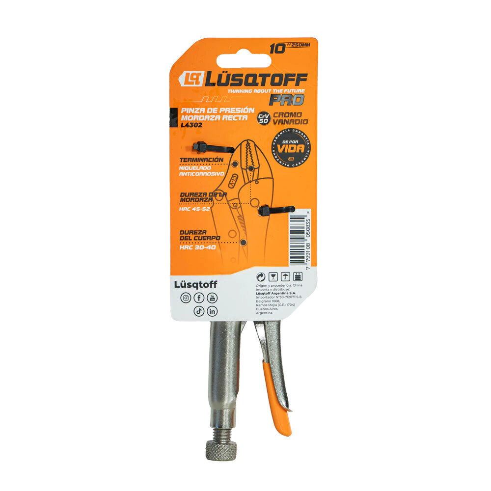 La pinza de presión PRO de 10” con mordaza recta Lusqtoff L4302 está diseñada para ofrecer una sujeción firme, estable y segura en todo tipo de trabajos mecánicos, industriales o de mantenimiento. Gracias a su cuerpo reforzado y su mordaza templada, garantiza una excelente durabilidad y precisión. Su acabado niquelado anticorrosivo la protege del desgaste diario, asegurando una larga vida útil.