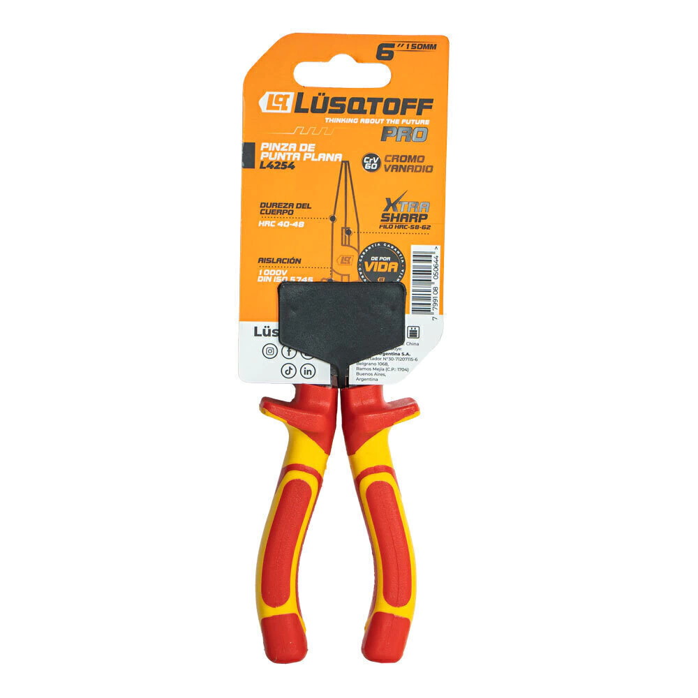 La pinza de punta plana PRO de 6” Lusqtoff combina precisión, seguridad y resistencia para trabajos eléctricos y de sujeción. Su aislación de 1.000 V bajo norma VDE DIN ISO 5746 garantiza protección profesional, mientras que su diseño de punta plana permite sujetar, doblar y manipular materiales con total control.