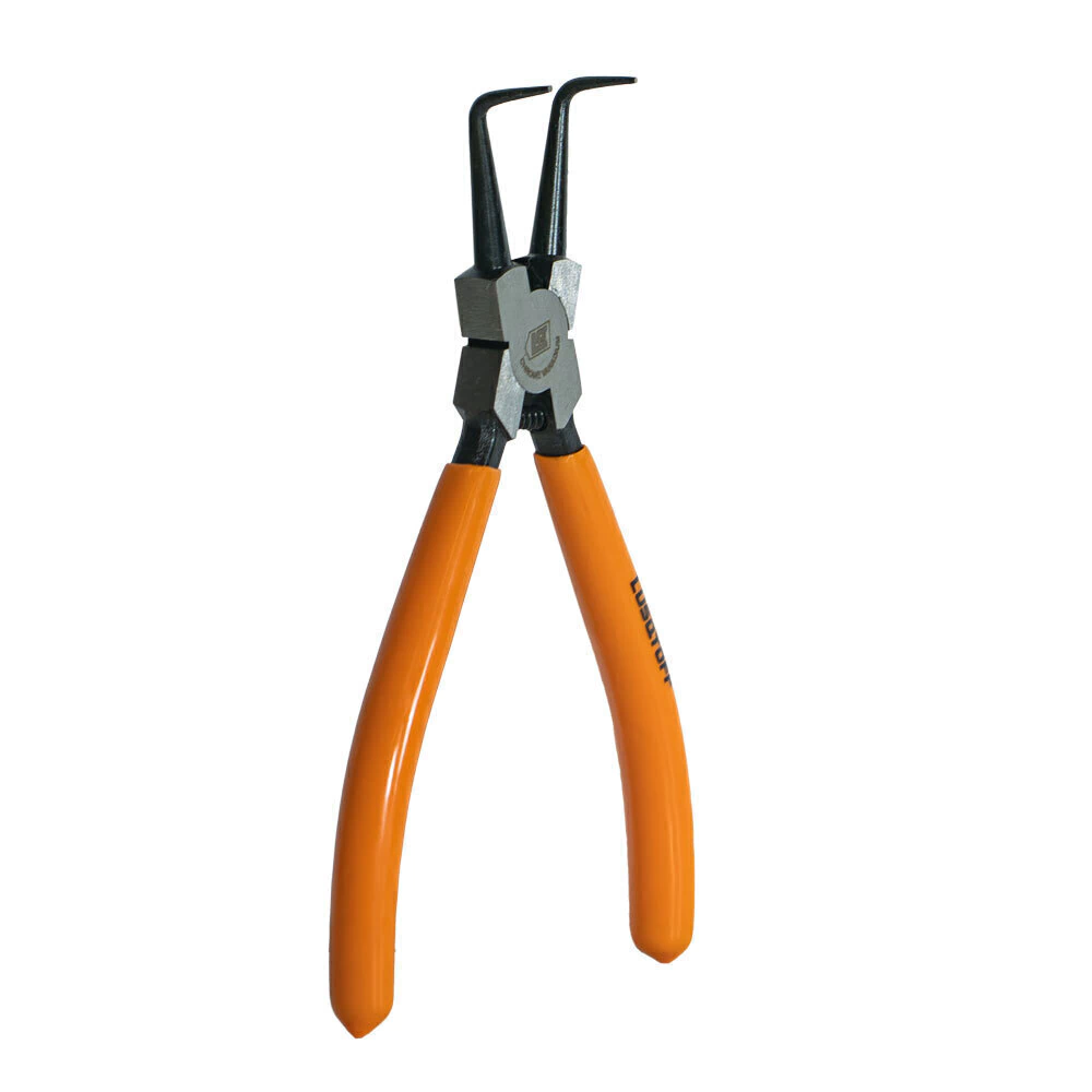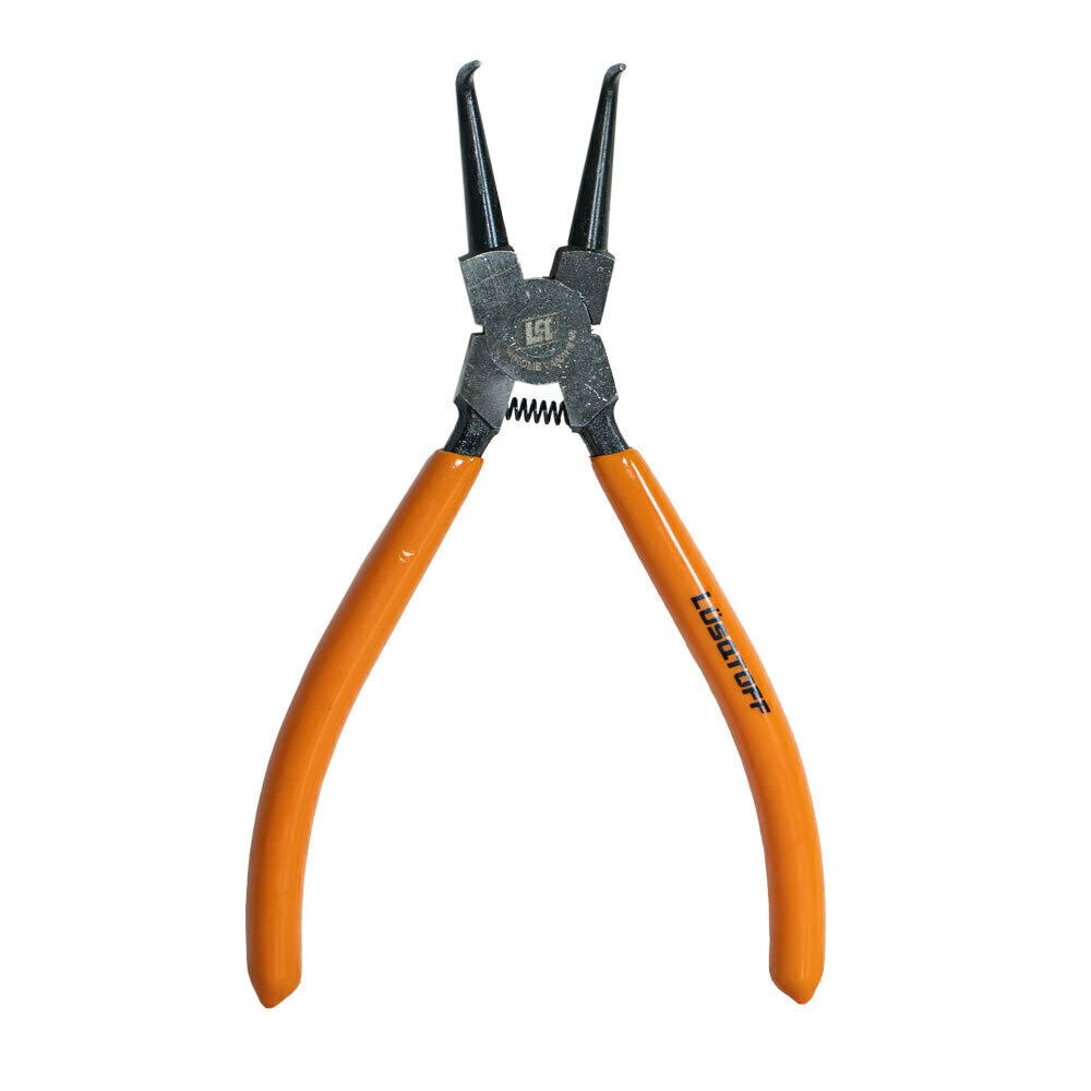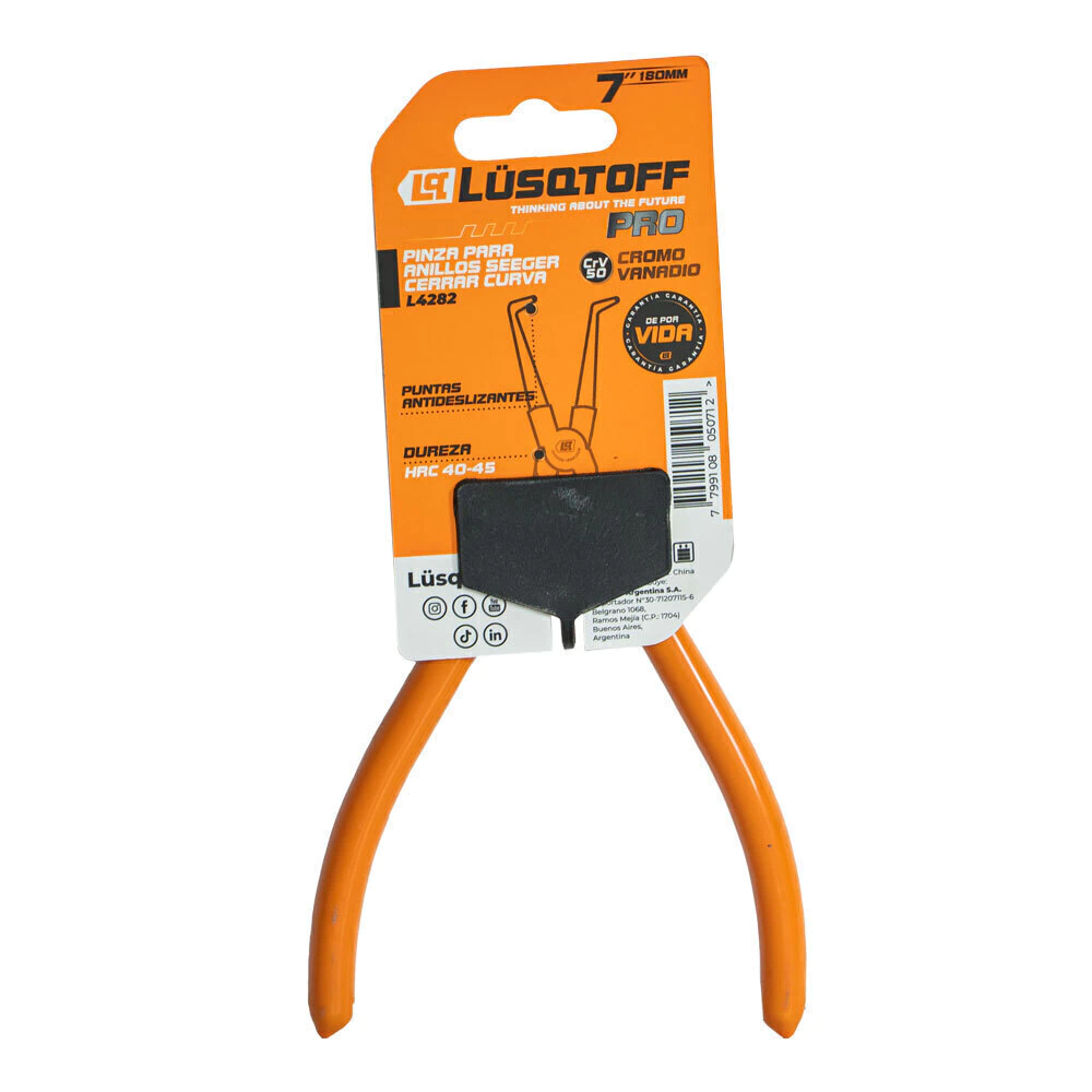 La pinza para anillo Seeger curva PRO de 7” Lusqtoff está diseñada para cerrar anillos de retención internos en lugares de difícil acceso. Su forma curva permite maniobrar con comodidad y precisión, mientras que las puntas antideslizantes aseguran un agarre firme durante todo el trabajo. Ideal para uso profesional o industrial.