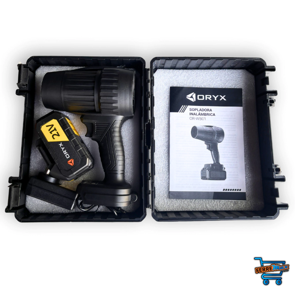 Soplador inalámbrico Oryx de 21 V con motor de 33.000 RPM, maletín rígido para guardarlo y transportarlo, y batería recargable para limpiar en casa, el taller o el jardín sin complicaciones 💨